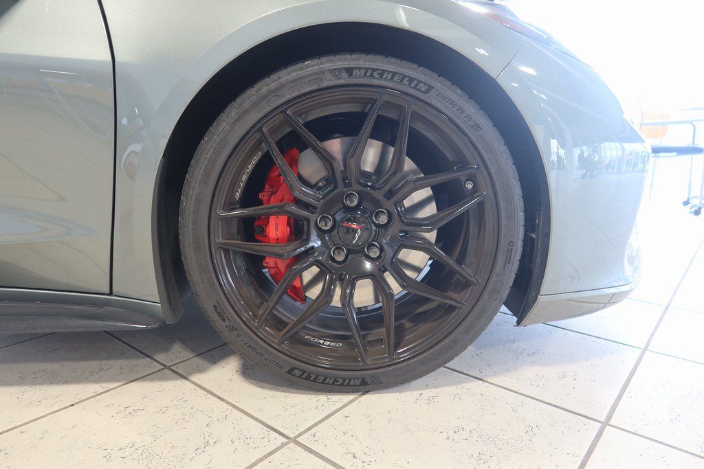 Enhancing the driving dynamics, this Corvette Z06 is equipped with a Battery Protection Package, Bright Red-Painted Calipers, and a set of stunning 20-inch front and 21-inch rear Black Forged Aluminum wheels. The Carbon Flash Metallic-Painted Outside Mirrors and Spoiler add a touch of elegance and aggression to the overall design.